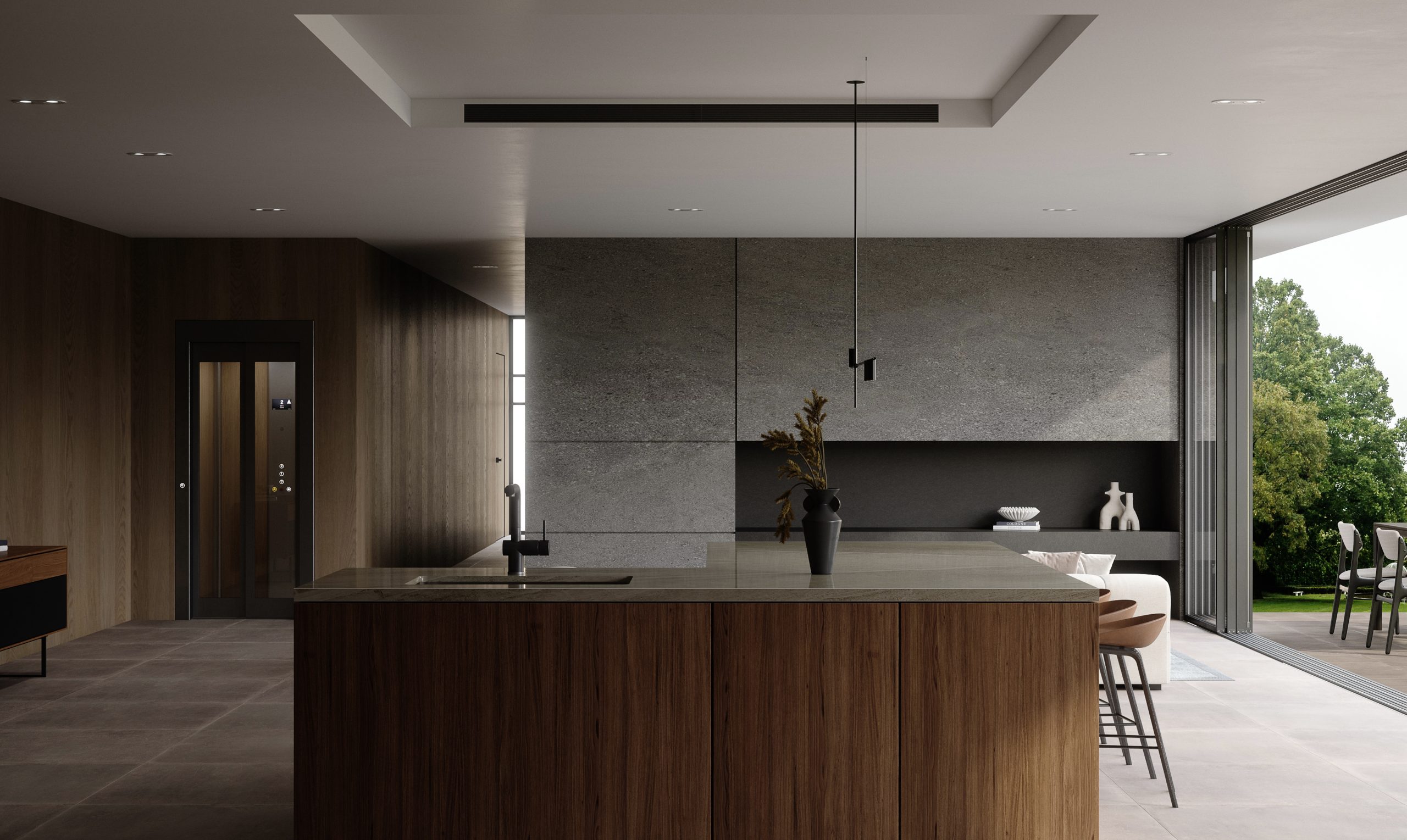 Un home lift Eltec Lift HLB, progettato per garantire accessibilità e comfort, integrato in modo armonioso grazie a struttura Eltec TA, tamponamento in vetro fumé…