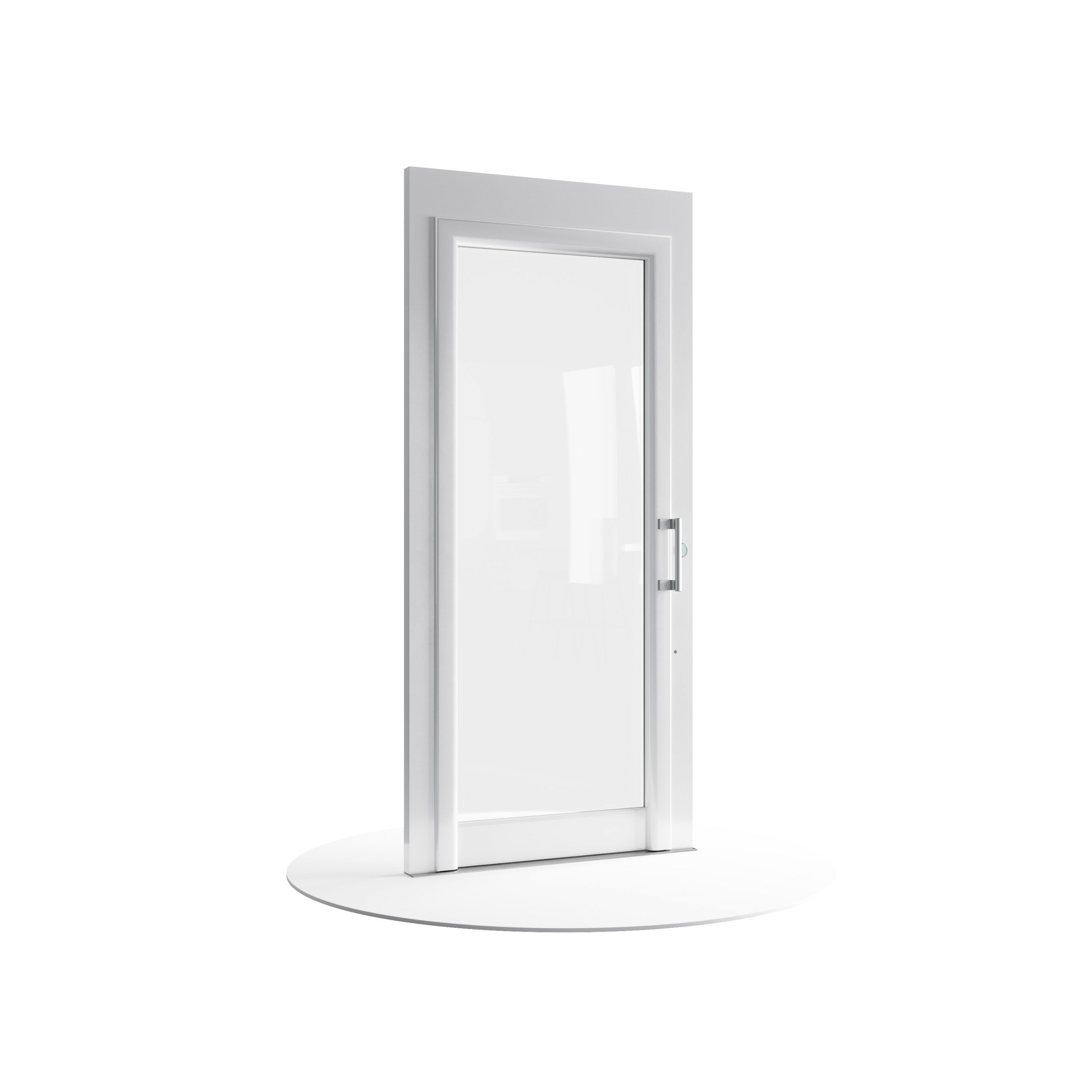 Porta in alluminio a singolo battente caratterizzata da profili squadrati, completa di sistema che permette l’inversione del senso di apertura.