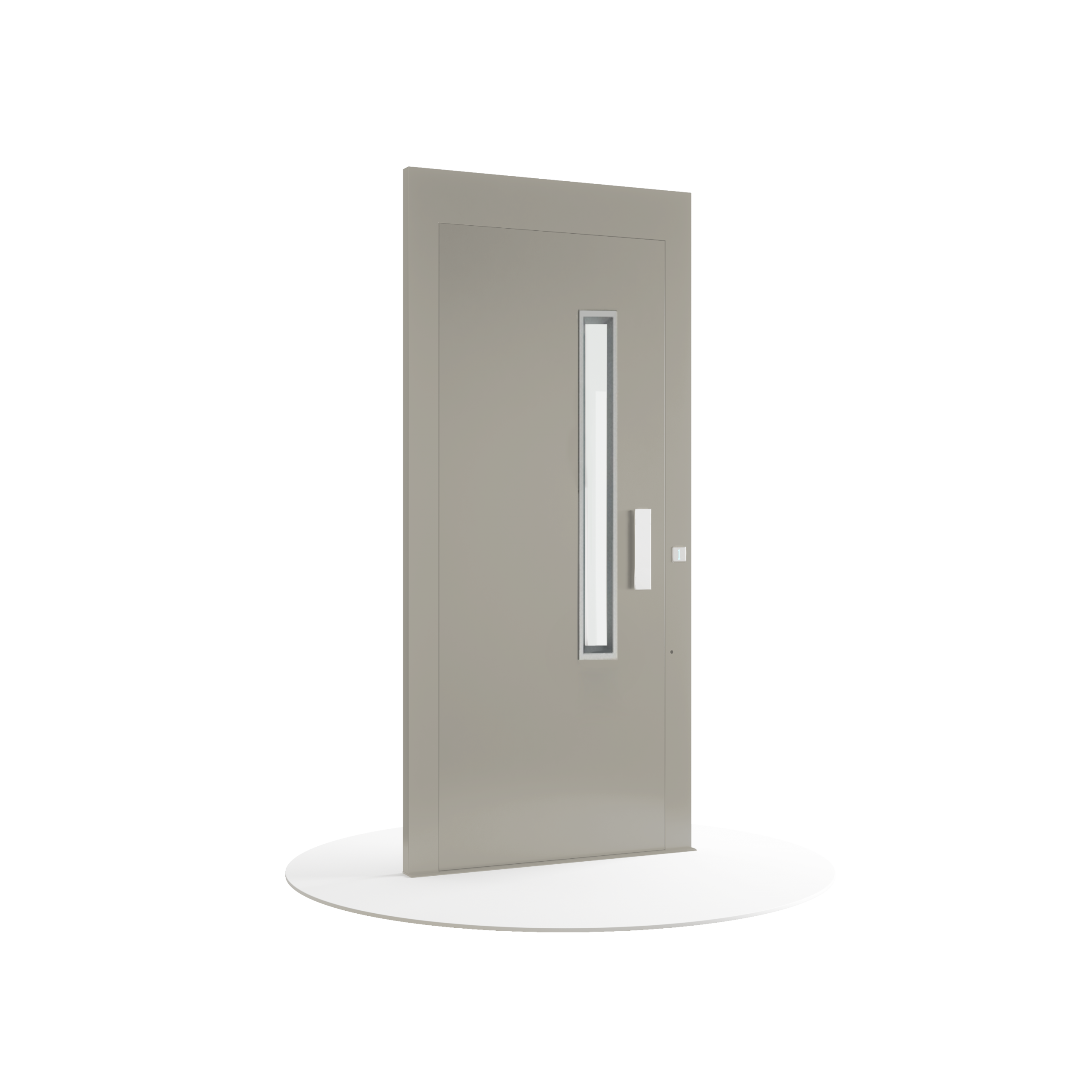 Porta in alluminio a battente singolo, dal design minimale con ampio vetro a vista. Il profilo dell’anta assume anche la funzione di maniglia, integrando un vano per l’illuminazione a LED, discreta e funzionale.