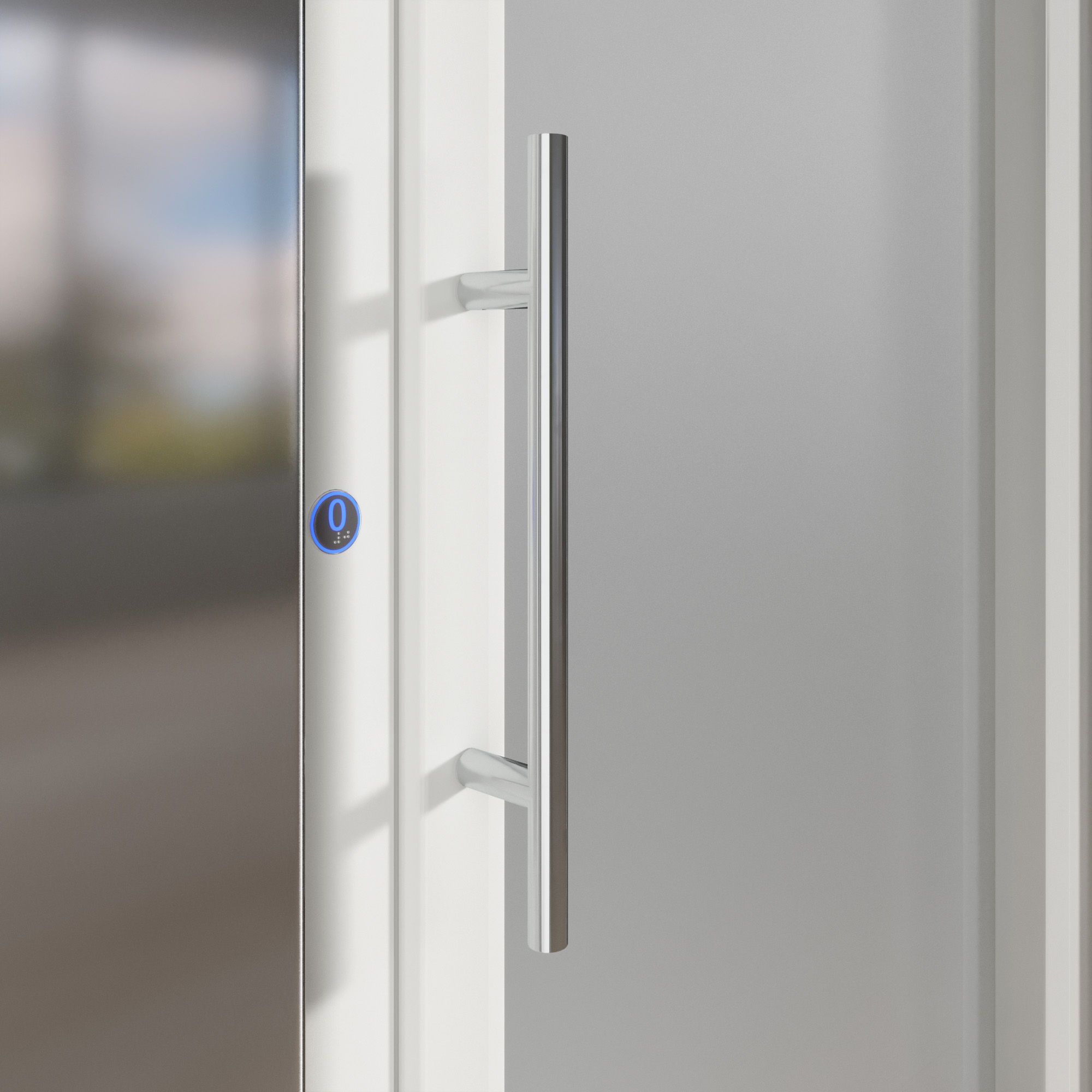 Porta a due ante battenti che, grazie alla sua eleganza e modernità, risulta discreta e perfettamente integrata tra impianto e ambiente. L’apertura e chiusura automatica delle due ante riducono gli ingombri e ne facilitano l’utilizzo.